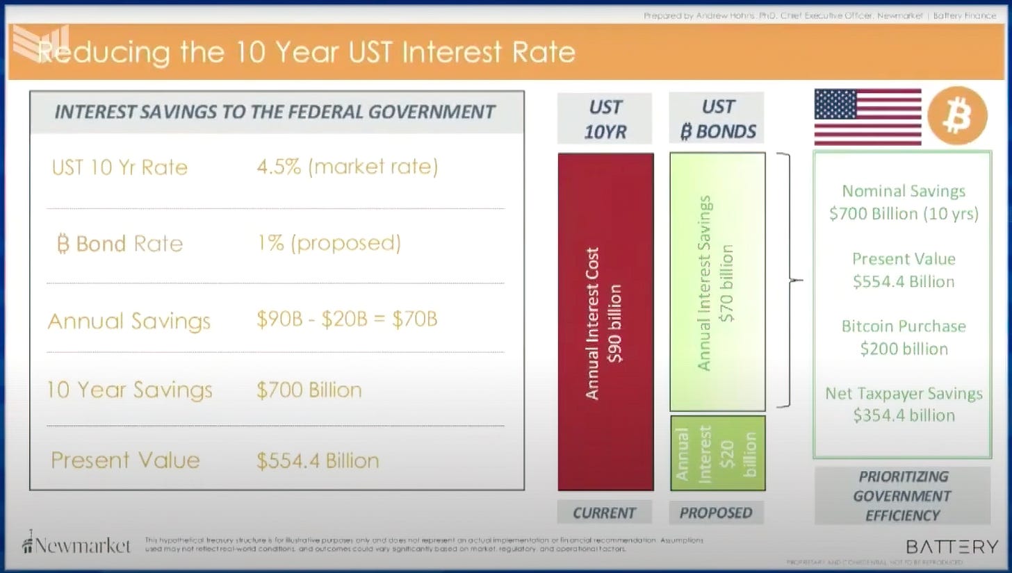 So, by Andrew’s calcs, on a $2 trillion issuance, the government could save approximately $70 billion per year in interest expenses, totaling $700 billion over the decade.