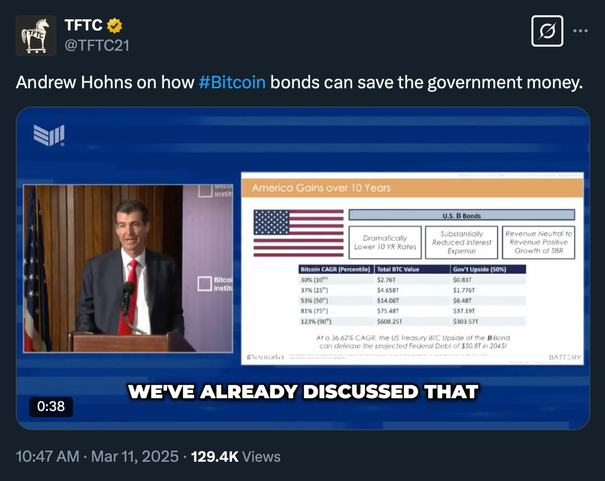 Andrew’s proposal is for the US government to issue $2 trillion in bonds, allocating 10% ($200 billion) of the proceeds to purchase Bitcoin, while the remaining 90% funds standard government expenditures (read: The Deficit).
