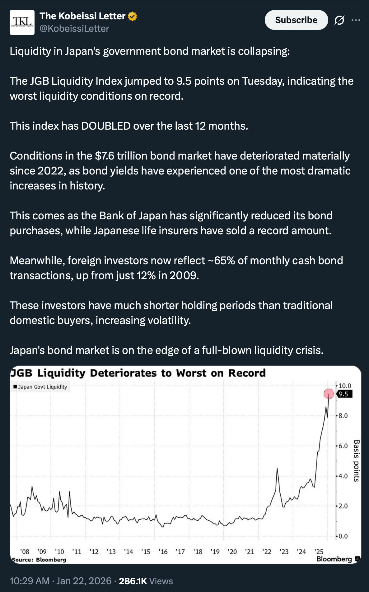 But hereâs what really has traders spooked: as Kobeissi highlighted above, liquidity in the worldâs second-largest government bond market has never been worse. The $7.6 trillion JGB market is showing classic signs of stress.