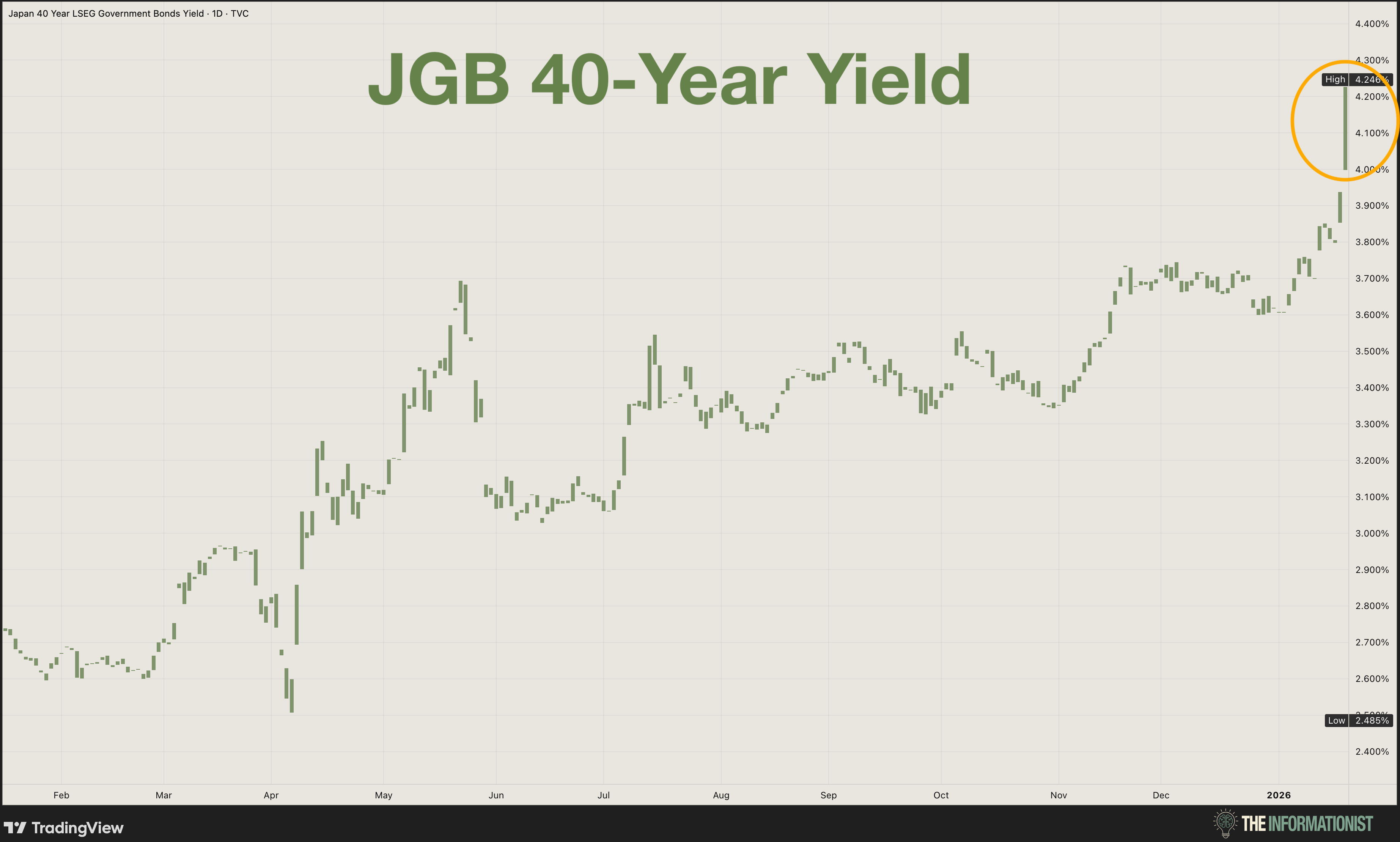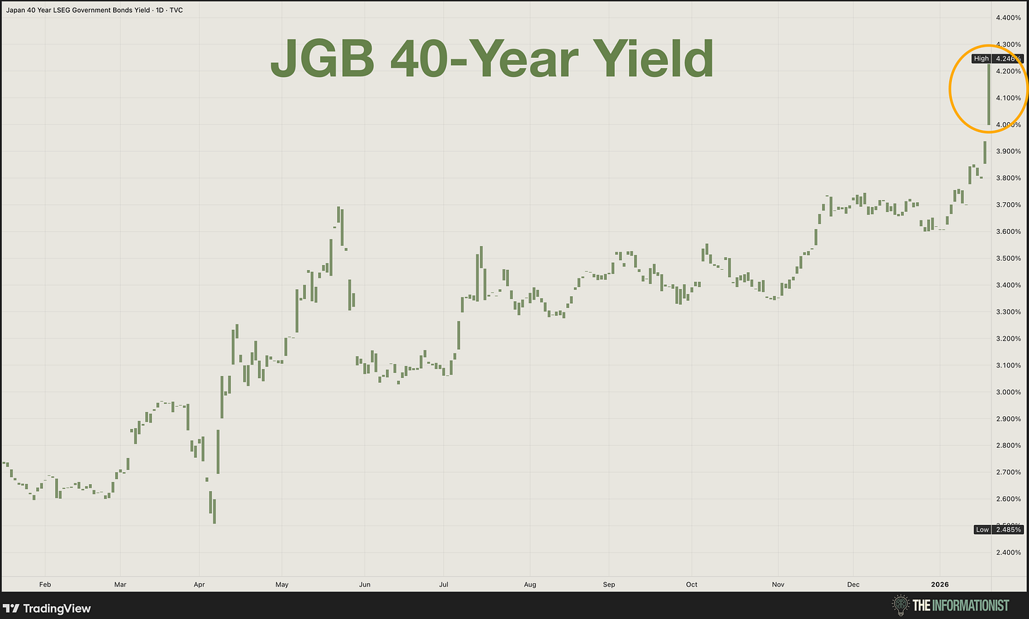 Japanâs 40-year government bond yield just spiked above 4.2% for the first time in over 30 years. The 30-year Japanese government bond (JGB) hit 3.6%. The 10-year is at 2.25%, more than double where it was just a year ago.
