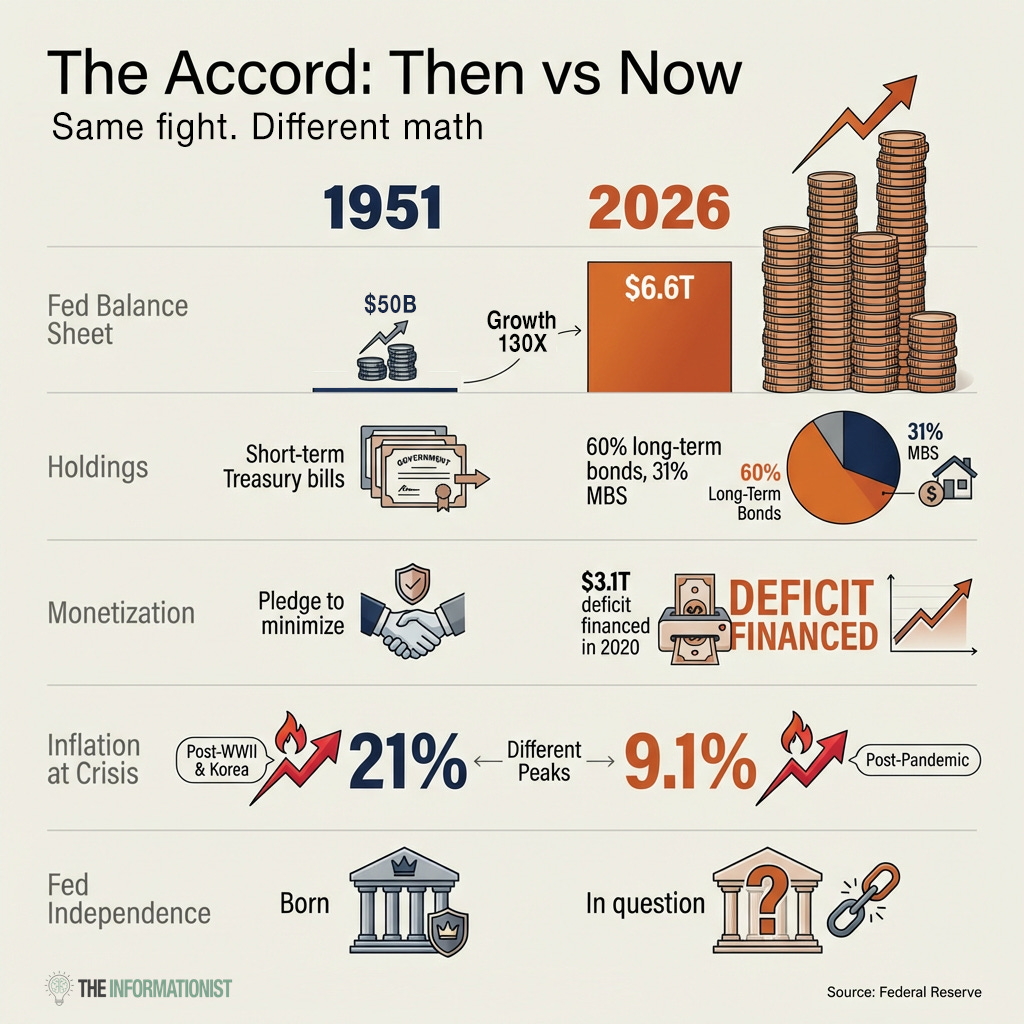 The 1951 accord worked because deficits were manageable. The government could afford to pay market rates on its borrowing. Today, with $36 trillion in debt and $1 trillion in annual interest costs, the math is starkly different.