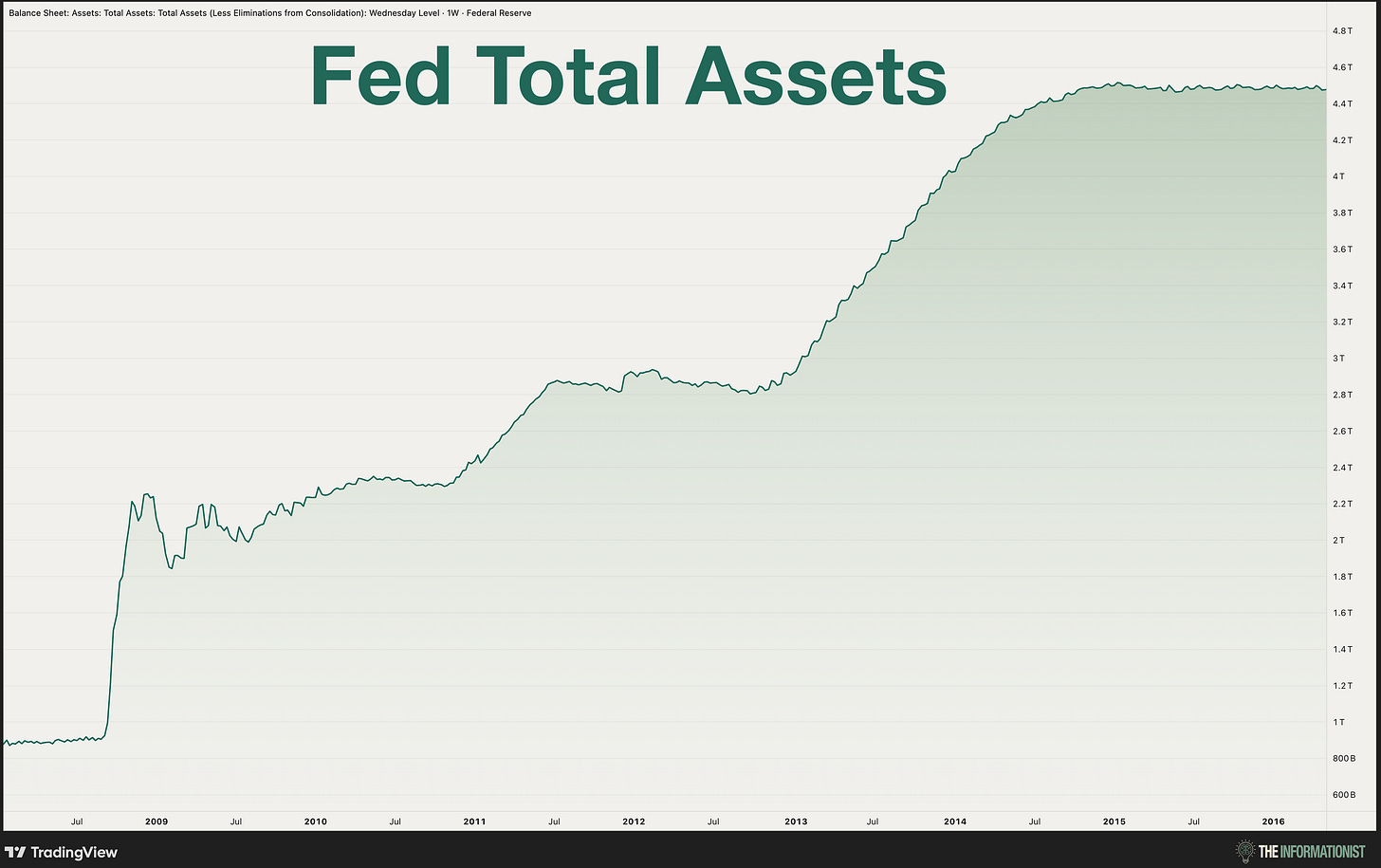 The Fed’s balance sheet, which had sat below $1 trillion for its entire history, pretty much doubled overnight. Then it doubled again.