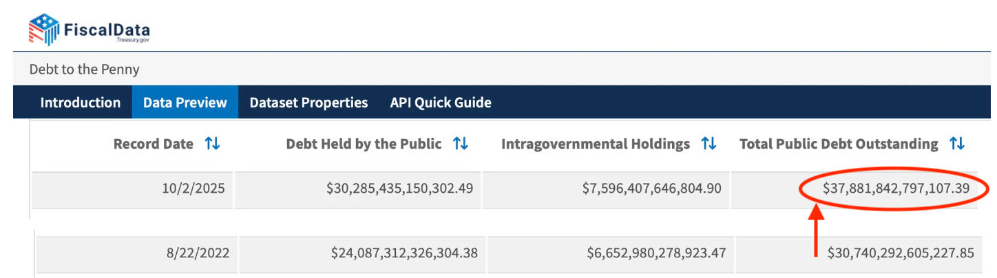 As of October 2025, US federal debt has blown past $37.8 trillionâthatâs over $7 trillion added in just three years.