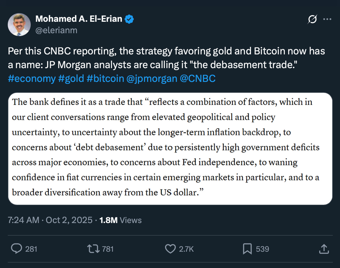 And when institutions like JP Morgan start telling clients to position for debasement, theyâre acknowledging that the game has changed.