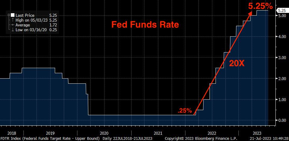 As we’ve been watching, the Fed has raised their target rate in a meteoric fashion, taking the overnight benchmark from 0.25% to 5.25% in a little over a year.