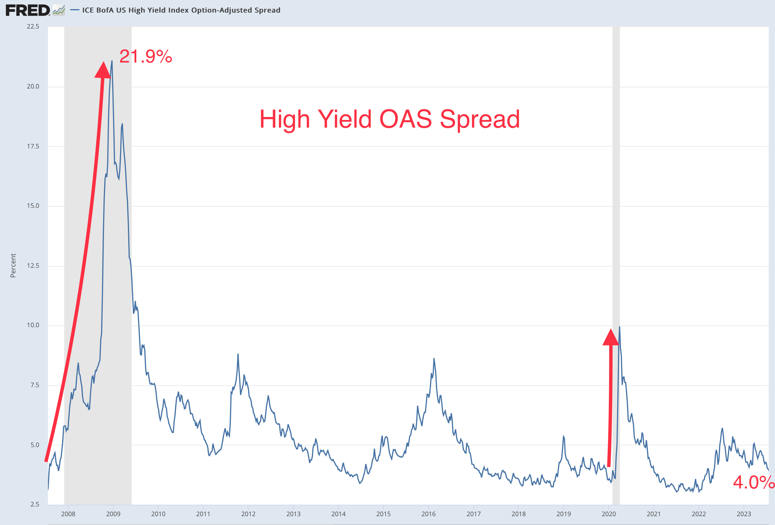 Taking it a step further, we can look at high yield bond OAS spreads.