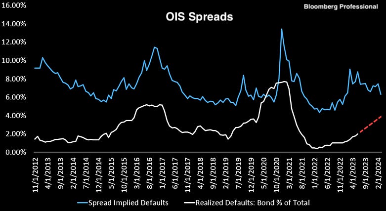 Looking at today’s spreads, Bloomberg is predicting an upturn in defaults, using OIS spreads as an indicator: