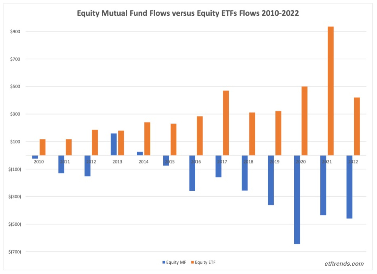 As you can see, as money pours into ETFs each year, a similar amount seems to flow out of mutual funds.