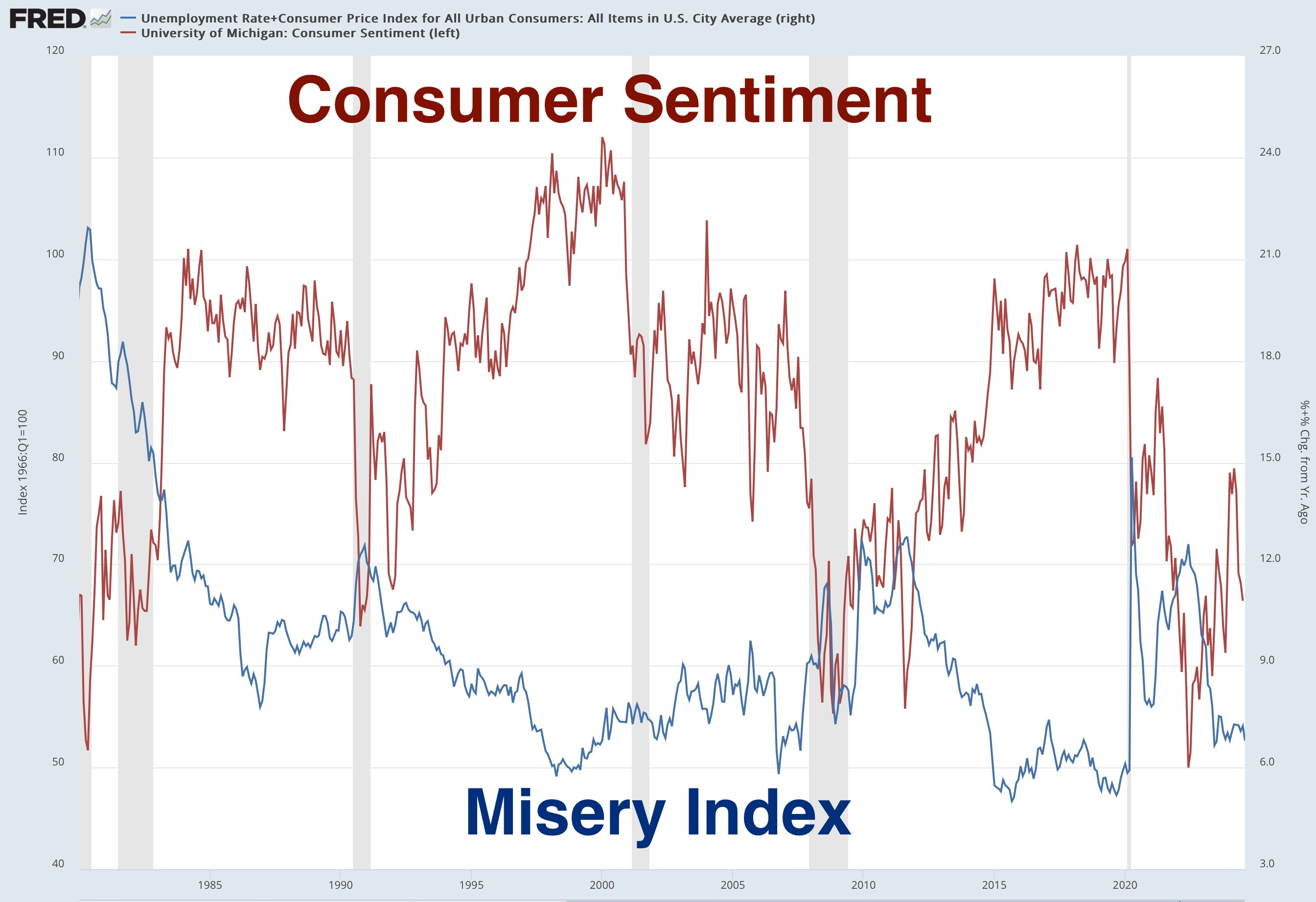 In any case, (h/t to Lyn Alden for recently pointing this out recently), when we chart the Consumer Sentiment on the same graph as the Misery Index, we can see that they are inversely correlated: