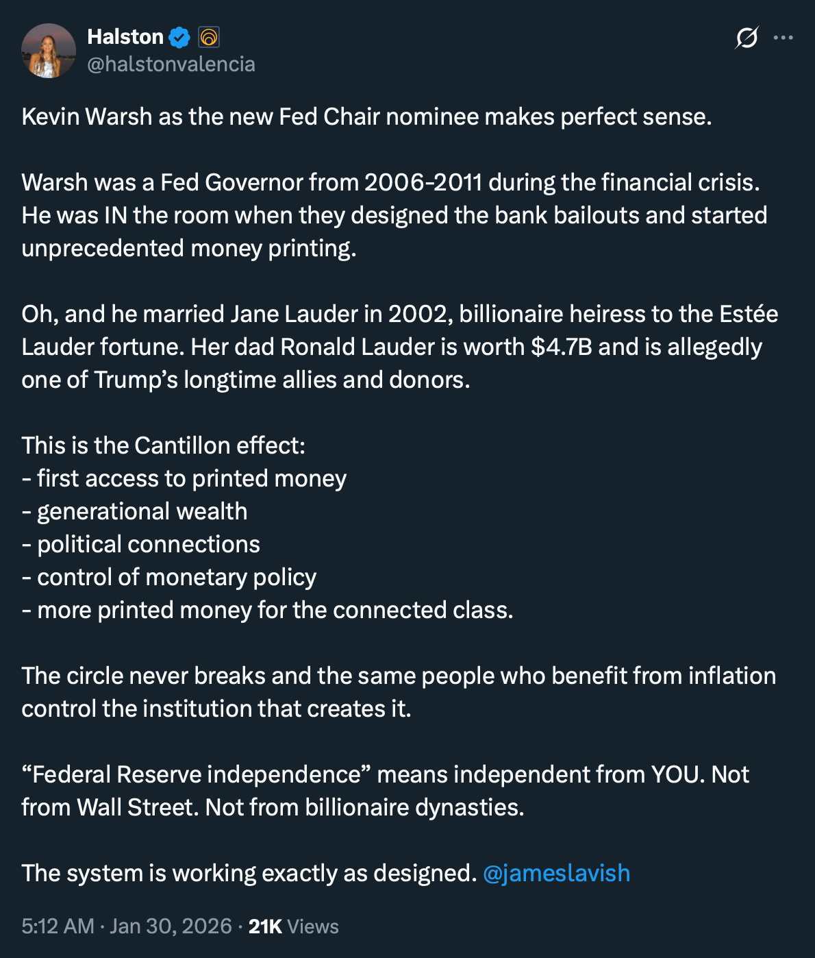 “Federal Reserve independence” means independent from YOU. Not from Wall Street. Not from billionaire dynasties.