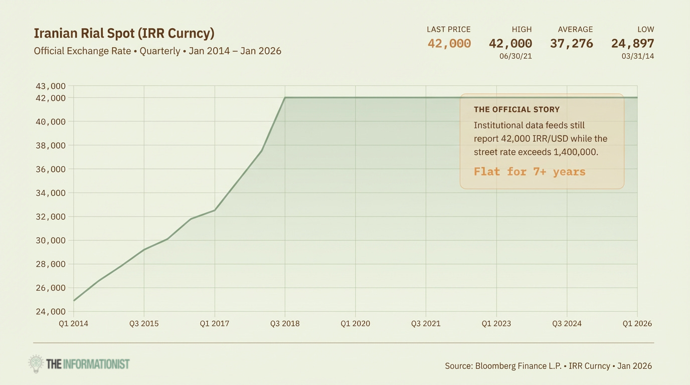 If you looked at the official exchange rate over this same period, you’d see something bizarre. A flat line at 42,000 rials per dollar. Just sitting there. Unchanged. For years. While the black market rate climbed relentlessly higher.