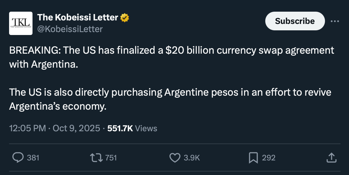 Amidst all the noise of China tariffs and leverage-driven crypto meltdowns this week, the US Treasury—not so quietly—performed another ‘rescue-like’ operation by extending a $20 billion lifeline to Argentina.