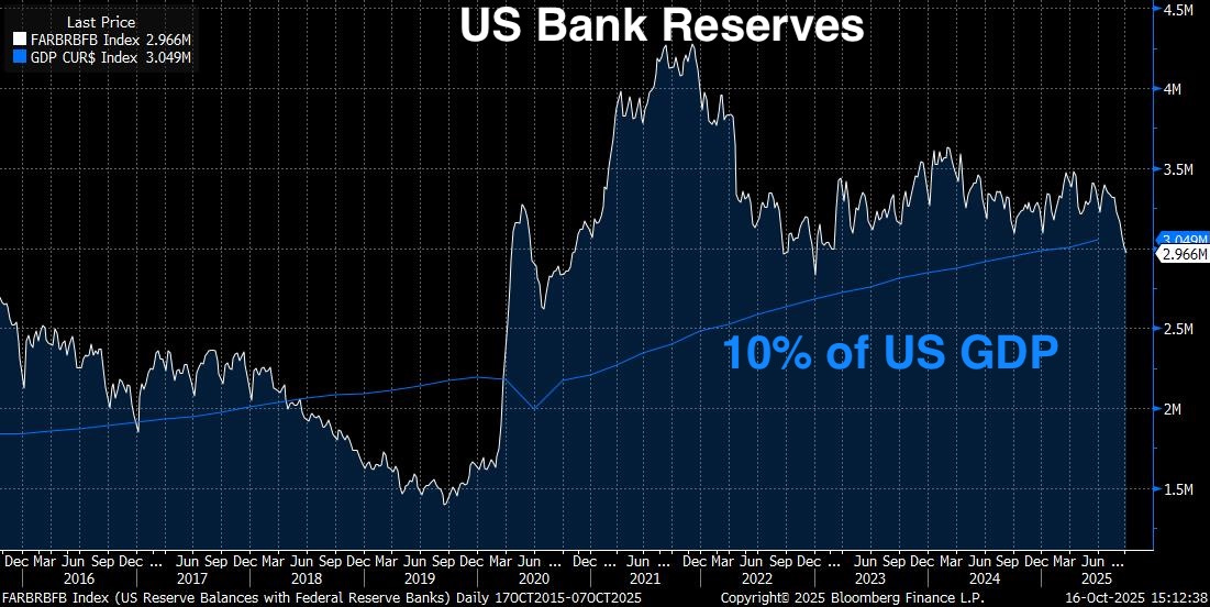 Jerome Powell has been very clear about this: the Fed starts getting nervous when bank reserves fall below roughly 10-11% of GDP.